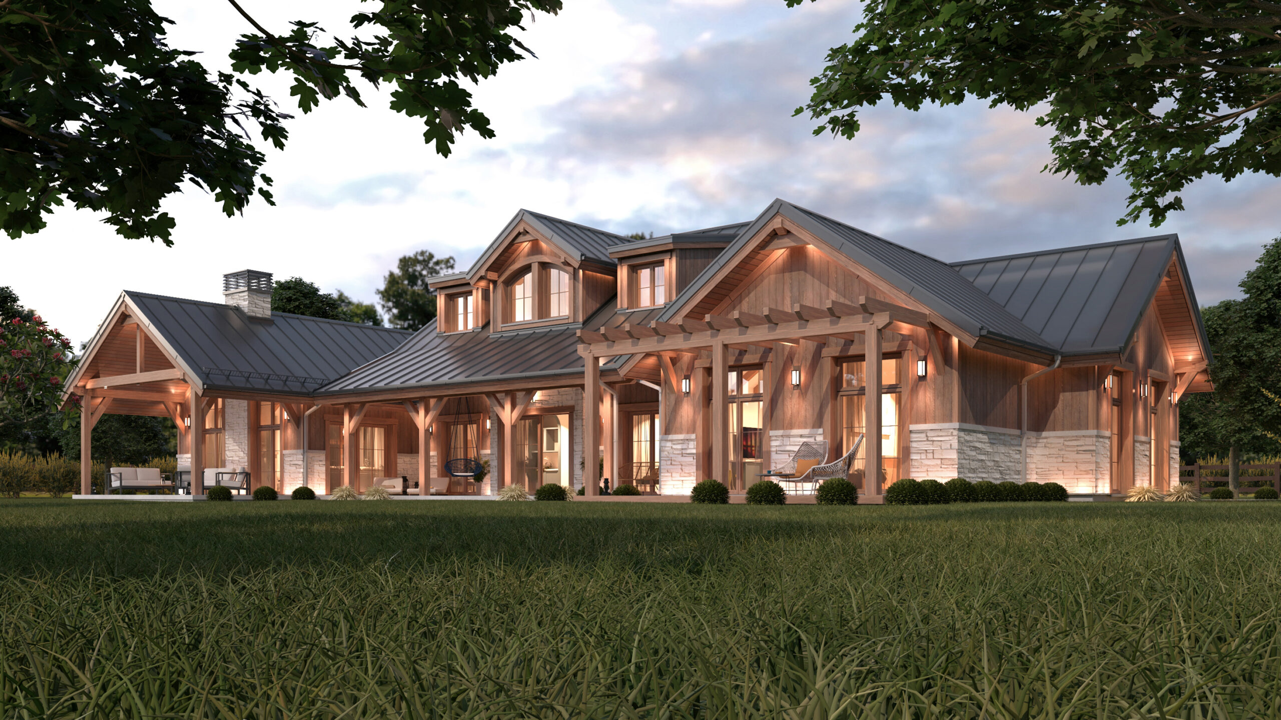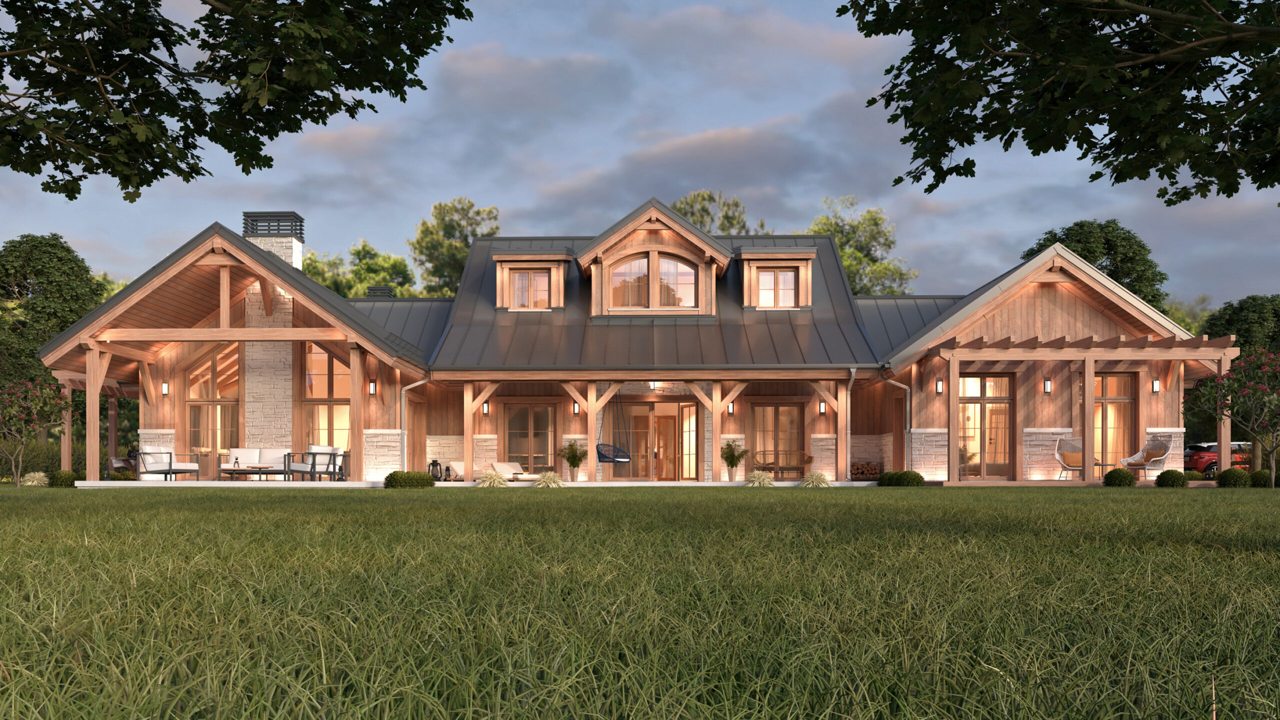 Charakterystyką domów w stylu ranczerskim są dominujące na elewacjach materiały naturalne oraz otwarty układ wnętrz sprzyjający rodzinnemu spędzaniu czasu. Naszym założeniem było stworzenie przytulnego domu, klasycznego z elementami klimatu wiejskiego wraz z zastosowaniem nowoczesnych materiałów i rozwiązań. Zaprojektowaliśmy wysokie cokoły obłożone jasnym kamieniem, które z powodzeniem imitują kamienne podmurówki rdzennych budynków rustykalnych. Pozostałe części ścian zewnętrznych zostaną pokryte pionowymi deskami naturalnymi w ciepłym, bukowym odcieniu. Elementem wyróżniającym dom jest dominujący dach, pokryty grafitową blachą systemową na tzw. rąbek stojący. Podbitki dachowe drewniane, obróbki blacharskie z blachy powlekanej grafitowej. Nadając nowoczesności postawiliśmy na zastosowanie prostokątnych rynien (grafitowych) oraz rur spustowych (metalicznych). Szerokie okapy oraz wysunięcia dachu nad tarasami wsparte na drewnianej konstrukcji z zastrzałami i licznymi elementami ciesielskimi, które tylko podkreślają rustykalny styl budynku. Zachowując ciepły odbiór elewacji zaplanowaliśmy okna ze szprosami w odcieniach drewna, oraz obramówki z desek wokół otworów. W projekcie nie mogło zabraknąć oświetlenia zewnętrznego w postaci licznych kinkietów ściennych czy LED-owych podświetleń podbitek dachowych, które wizualnie odciążają dach.