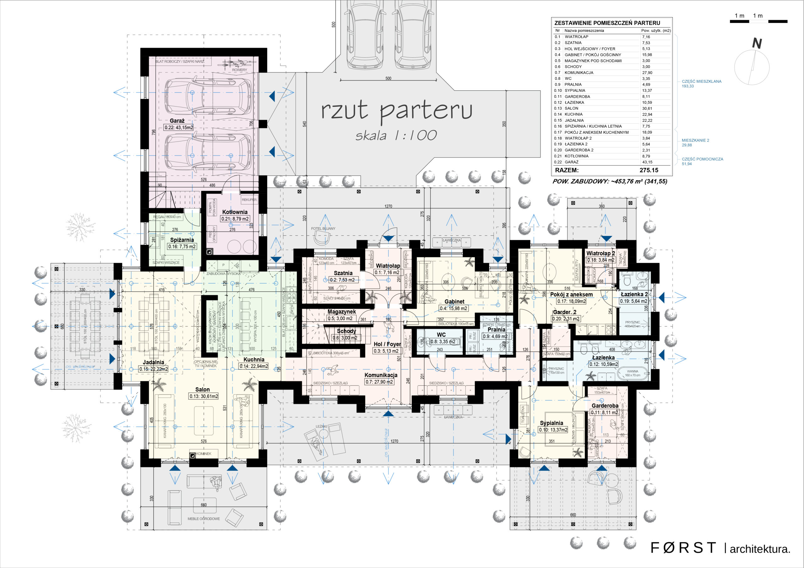 Około 275 metrów kwadratowych parteru mieści wszystkie potrzebne pomieszczenia niezbędne do funkcjonowania dużej rodziny. Po wejściu do domu znajdziemy się w przestronnym wiatrołapie z siedziskami i bezpośrednim dostępem do wydzielonej, wygodnej szatni. Następnie przez szerokie, dwuskrzydłowe drzwi wchodzimy do foyer, które wraz z korytarzem stanowią serce komunikacyjne domu. Stąd możemy dostać się do gabinetu, magazynku pod schodami czy klatki schodowej prowadzącej na poddasze budynku. Korytarz główny, jako pomieszczenie z którego korzystamy najczęściej, zlokalizowany został wzdłuż południowej ściany domu i wyposażony w duże przeszklenia, siedziska, kącik biblioteczny oraz liczne osie widokowe na ogród. Kierując się ku strefie dziennej znajdziemy się w Salonie z kominkiem i wysokim skośnym sufitem, jadalni przeszklonej z trzech stron i wygodnej kuchni z wyspą oraz wyjściem przed dom. W bezpośrednim sąsiedztwie kuchni znajduje się spiżarka stanowiąca kuchnię letnią oraz dostęp do garażu i kotłowni budynku. W prawym skrzydle domu zlokalizowaliśmy pomieszczenia stref prywatnych gdzie znajdują się: WC, pralnia, sypialnia rodziców z prywatną łazienką i garderobą oraz mieszkanie dla starszej osoby w skład którego wchodzi pokój z aneksem kuchennym, wiatrołap i wygodna łazienka z możliwością wjazdu wózkiem inwalidzkim.