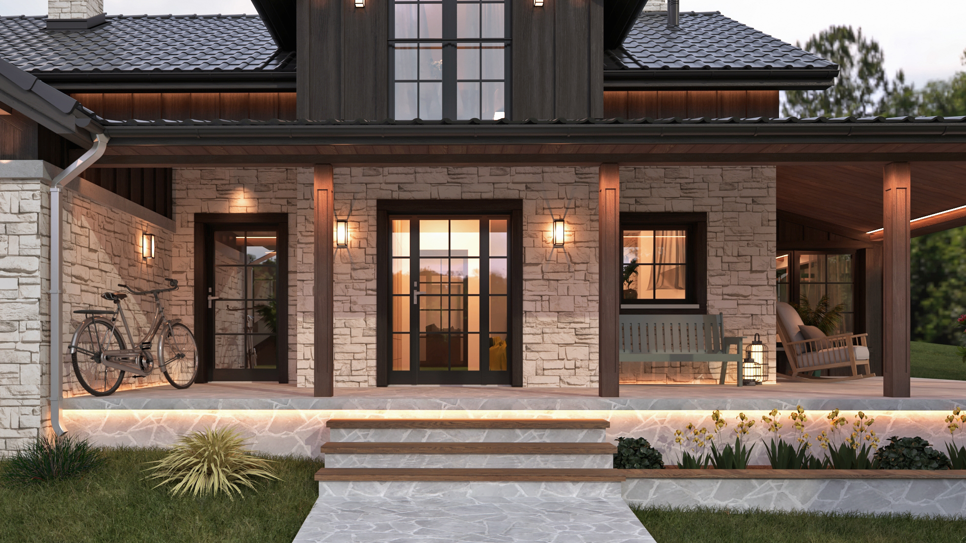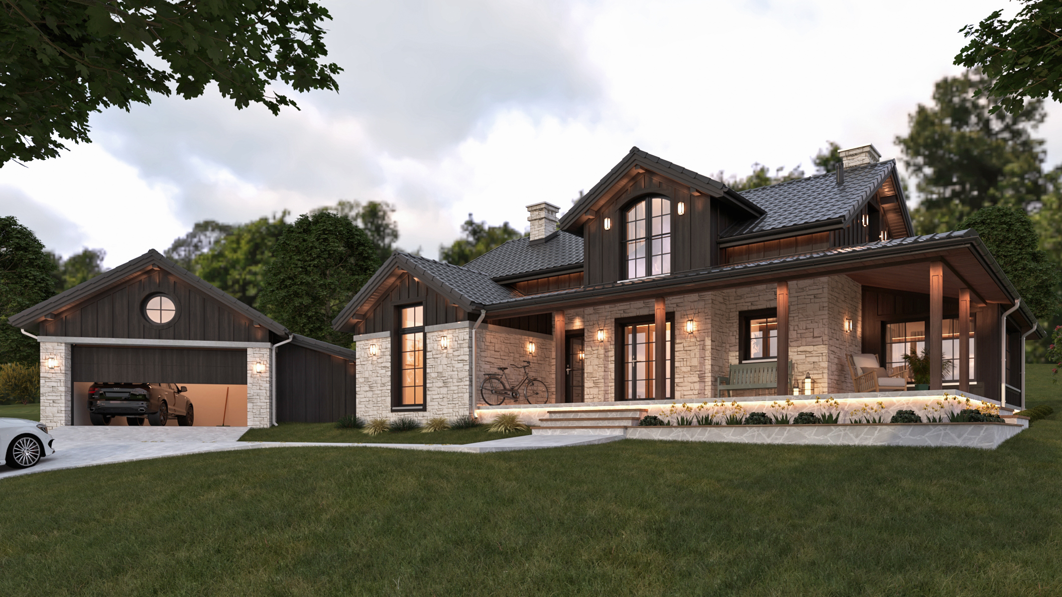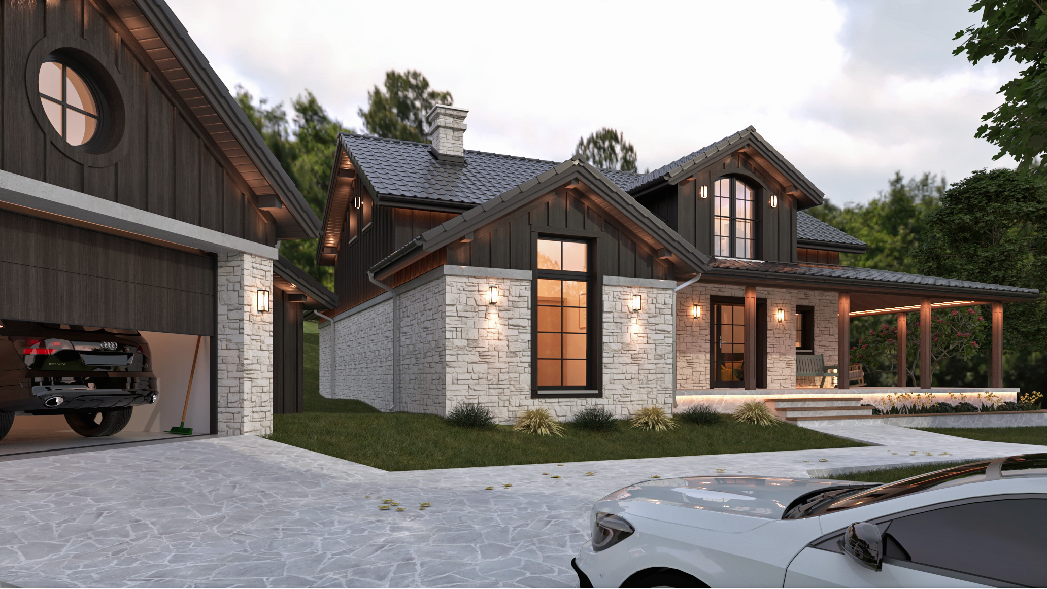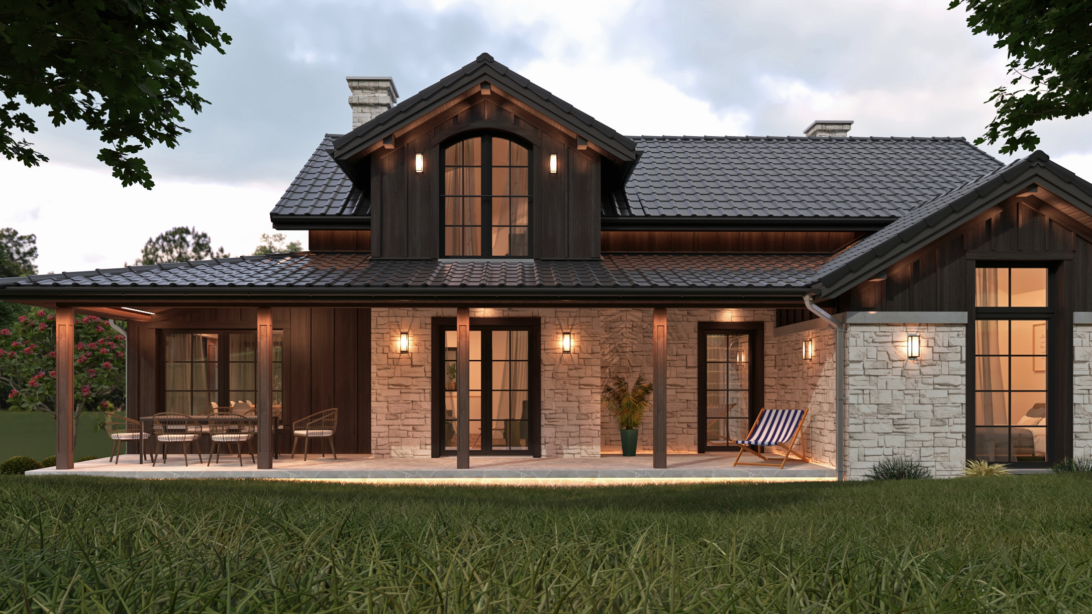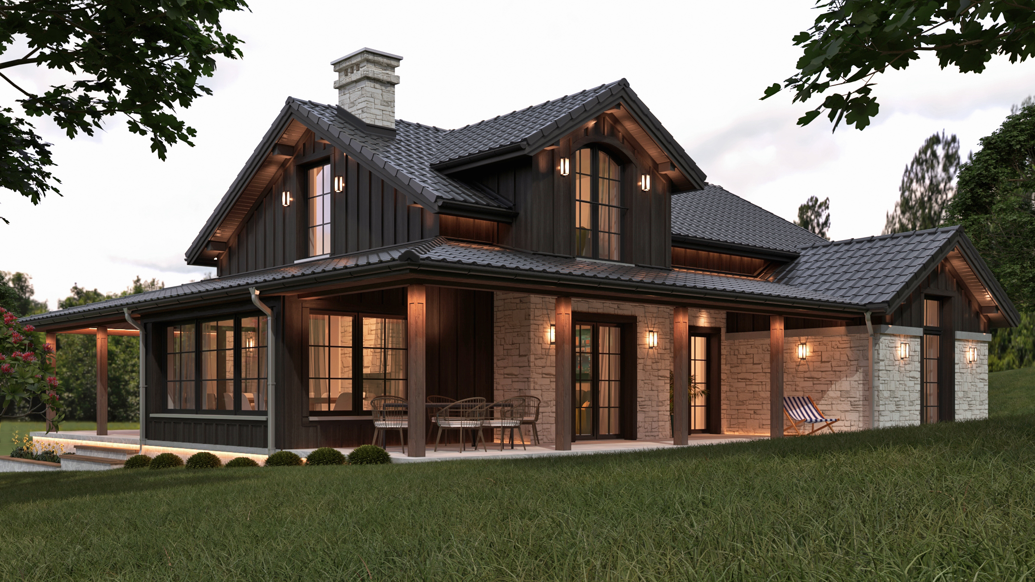Przepisy miejscowe, ustanowione w porozumieniu z Wojewódzkim Konserwatorem Zabytków, ściśle parametryzują przyszły wygląd zabudowy. Zadaniem było stworzenie domu, który jednocześnie spełni oczekiwania inwestorów, z drugiej zaś strony będzie harmonijnie wkomponowany w zabytkowy, chroniony kontekst ruralistyczny zabudowy wsi. Biorąc pod uwagę powyższe, oraz ściśle sprecyzowane parametry w zakresie pochylenia, koloru i układu dachów, dopuszczalnych materiałów elewacyjnych i ich odcieni czy chociażby wielkości zabudowy stworzyliśmy dom w stylu „Modern Rustic Farmhouse”. Dachy kryte dachówką ceramiczną w kolorze grafitowym, kamień w odcieniach trawertynu, ciemne drewno na ścianach kolankowych i szczytowych poddasza (charakterystyczne dla tradycyjnej zabudowy karkonoskiej) to podstawowe materiały elewacyjne. Nie chcieliśmy aby dom był zbyt „sielski” dlatego zaprojektowaliśmy stolarkę okienną z charakterystycznymi szprosami, które nadają elegancji. Pozostając przy stylu farmhouse z dwóch stron domu zaplanowaliśmy zadaszenia, tworzące klimatyczne miejsca do wypoczynku na tarasach.