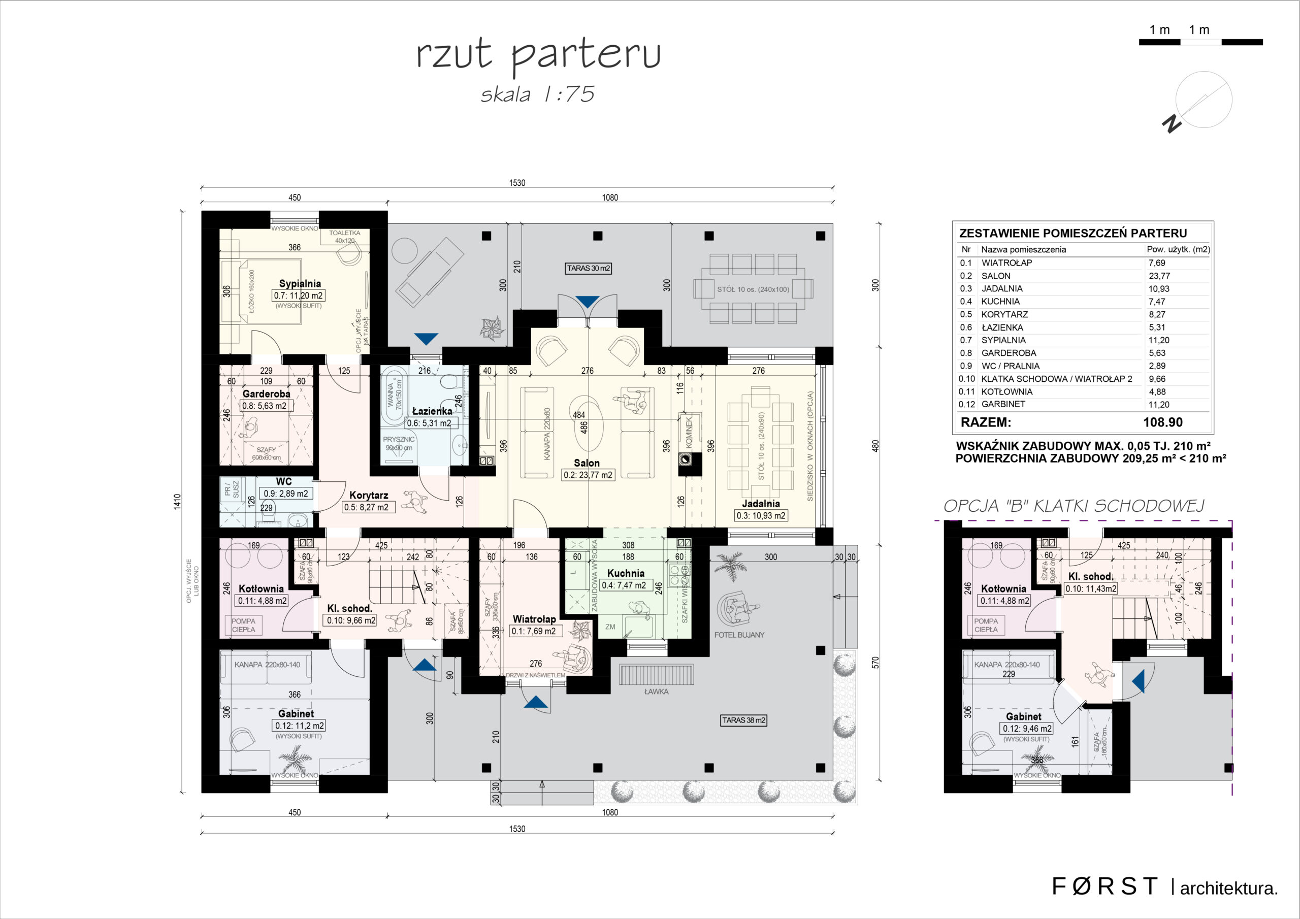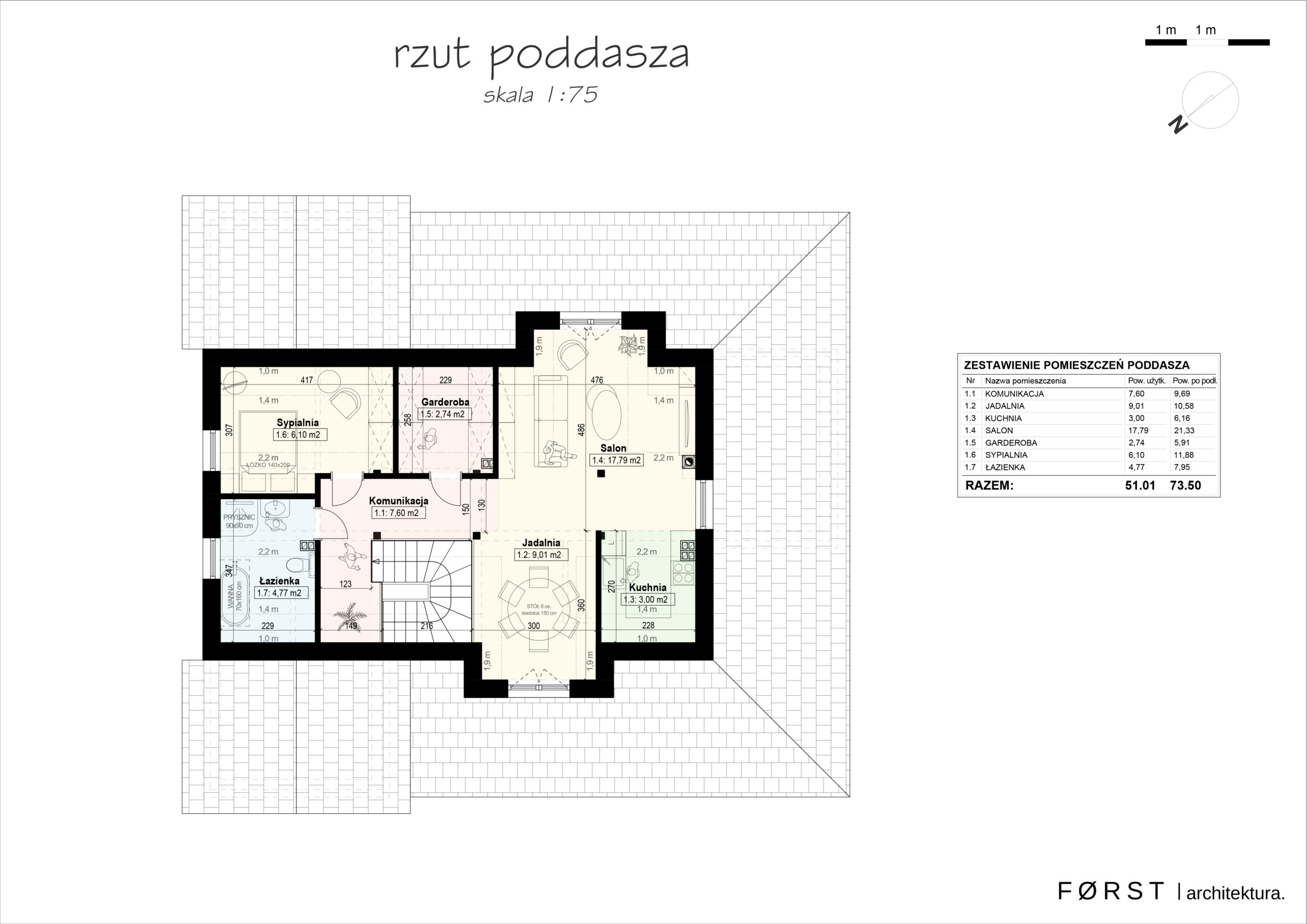 W zakresie funkcji wewnętrznej pomieszczeń mieliśmy jasne i sprecyzowane oczekiwania od przyszłych domowników. Podstawowym zadaniem było stworzenie dwóch niezależnych mieszkań z podziałem na poszczególne kondygnacje, z możliwością logicznego przekształcenia ich w jedno w przyszłości. To determinowało zaprojektowanie odrębnych wejść, nieszablonowego układu klatki schodowej oraz wielobryłowość budynku. Równe 160 metrów kwadratowych powierzchni użytkowej mieści wszystkie potrzebne pomieszczenia niezbędne do prawidłowego funkcjonowania. W projektowanym parterze domu znajduje się przestronny wiatrołap, salon z widokiem na wzgórze i las, kuchnia z oknem na wjazd, przeszklona jadalnia z możliwością wykonania siedzisk, łazienka główna z wyjściem na taras, sypialnia, garderoba i wc dla gości. Dodatkowo wydzielona część z odrębnym wejściem, klatką schodową, kotłownią i gabinetem do pracy. Poddasze jako osobne mieszkanie wyposażone w korytarz, otwarty salon i jadalnię, niewielką kuchnię, oddzielną garderobę, sypialnię i łazienkę.