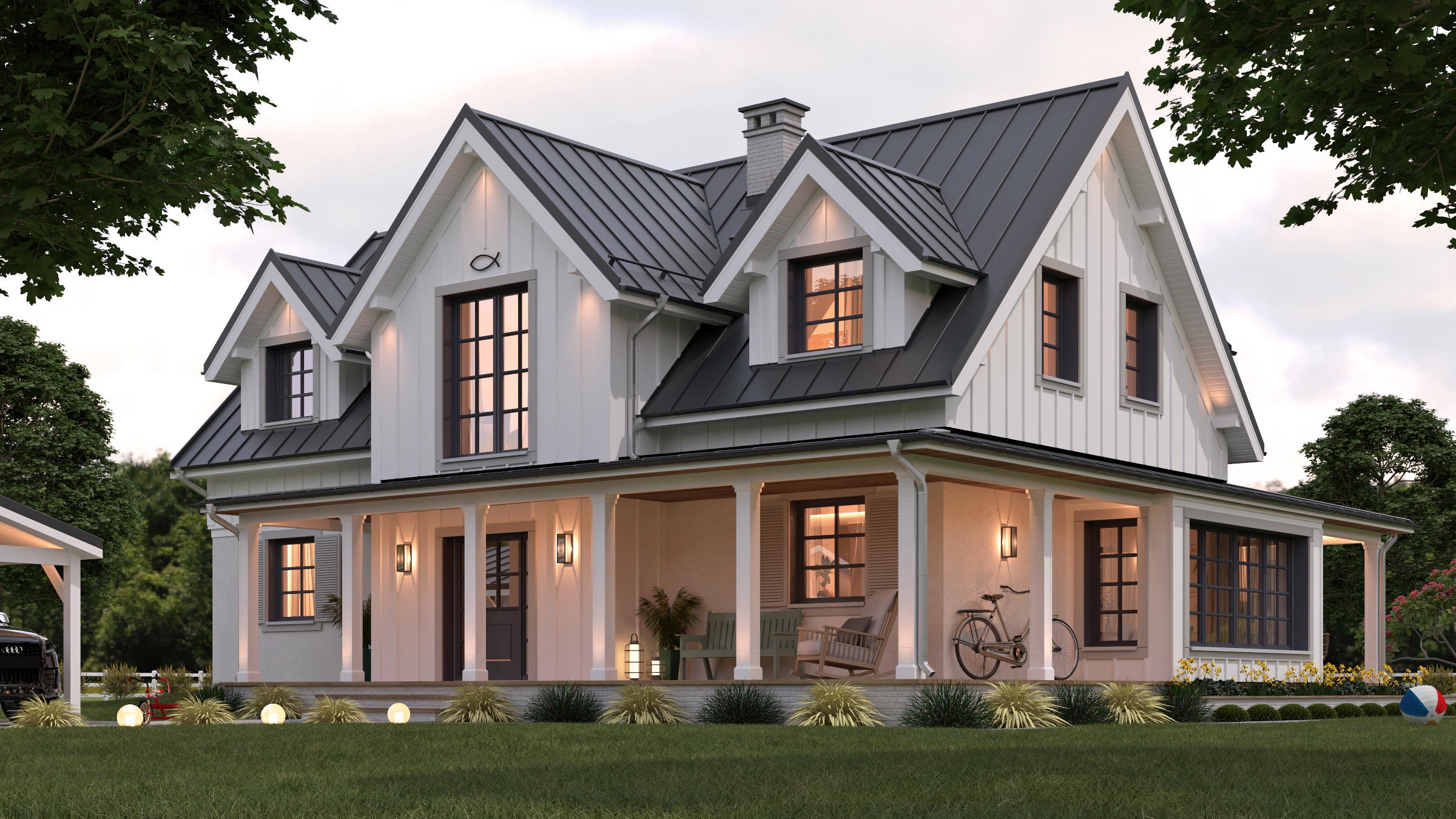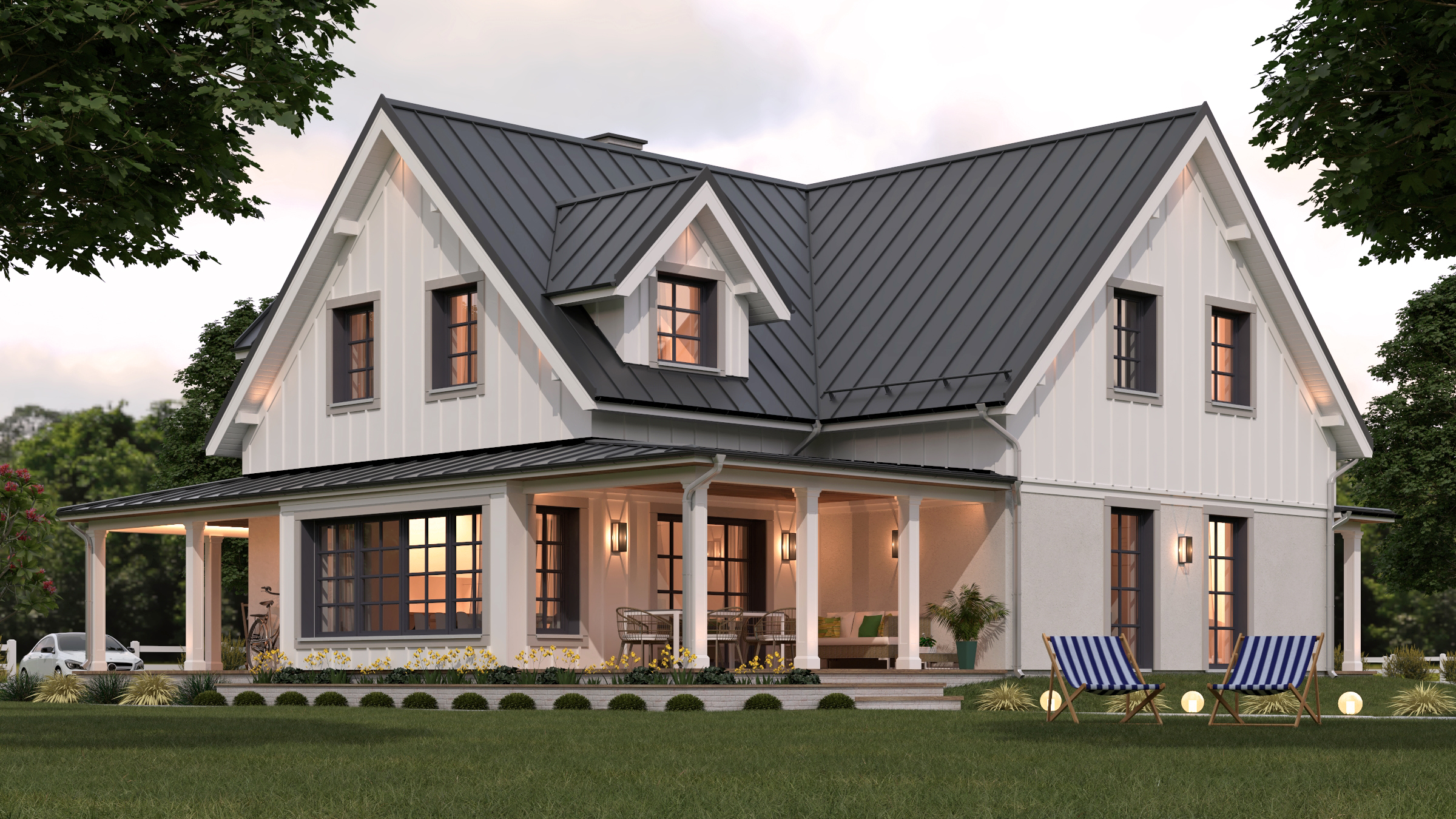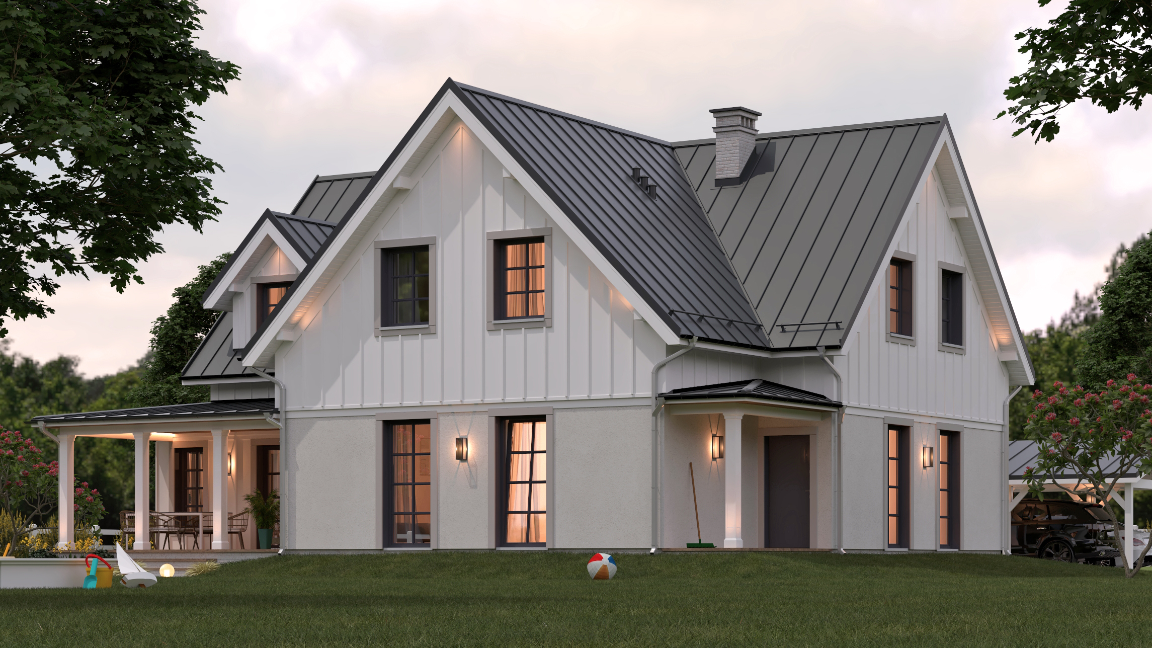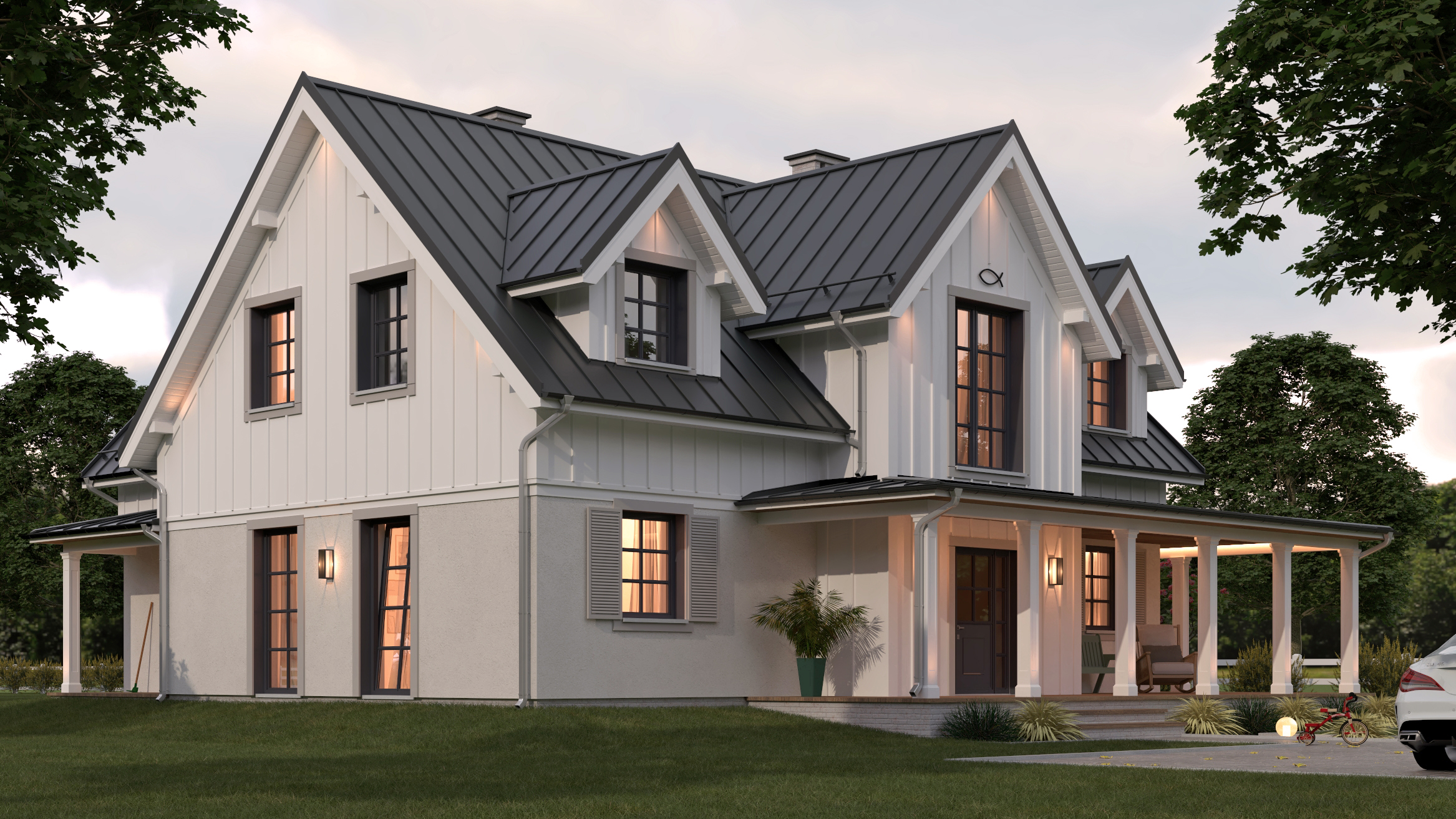 Zaprojektowana bryła domu z dachem dwuspadowym, ma tradycyjny charakter, który podkreśliliśmy licznymi lukarnami dachowymi, wykuszami oraz gankami okalającymi budynek od frontu i ogrodu. Kolorystyczną bazę stanowią stonowane materiały elewacyjne takie jak: beżowy tynk ścian parteru, charakterystyczna biała okładzina drewniana ścian szczytowych i kolankowych poddasza, białe słupy ganków, białe podbitki dachowe (siding) oraz beżowa cegiełka na cokołach i kominach. Dla przełamania jasnych odcieni zaproponowaliśmy ciemne okna ze szprosami (ciemne glify otworów okiennych z beżowymi obramowaniami w postaci desek) oraz kontrastujący ciemny dach pokryty nowoczesnymi panelami z blachy. Liczne punkty świetlne oraz drewniane tarasy i podbitki ganków (w odcieniach naturalnego drewna) nadają ciepły i przytulny odbiór elewacji budynku.