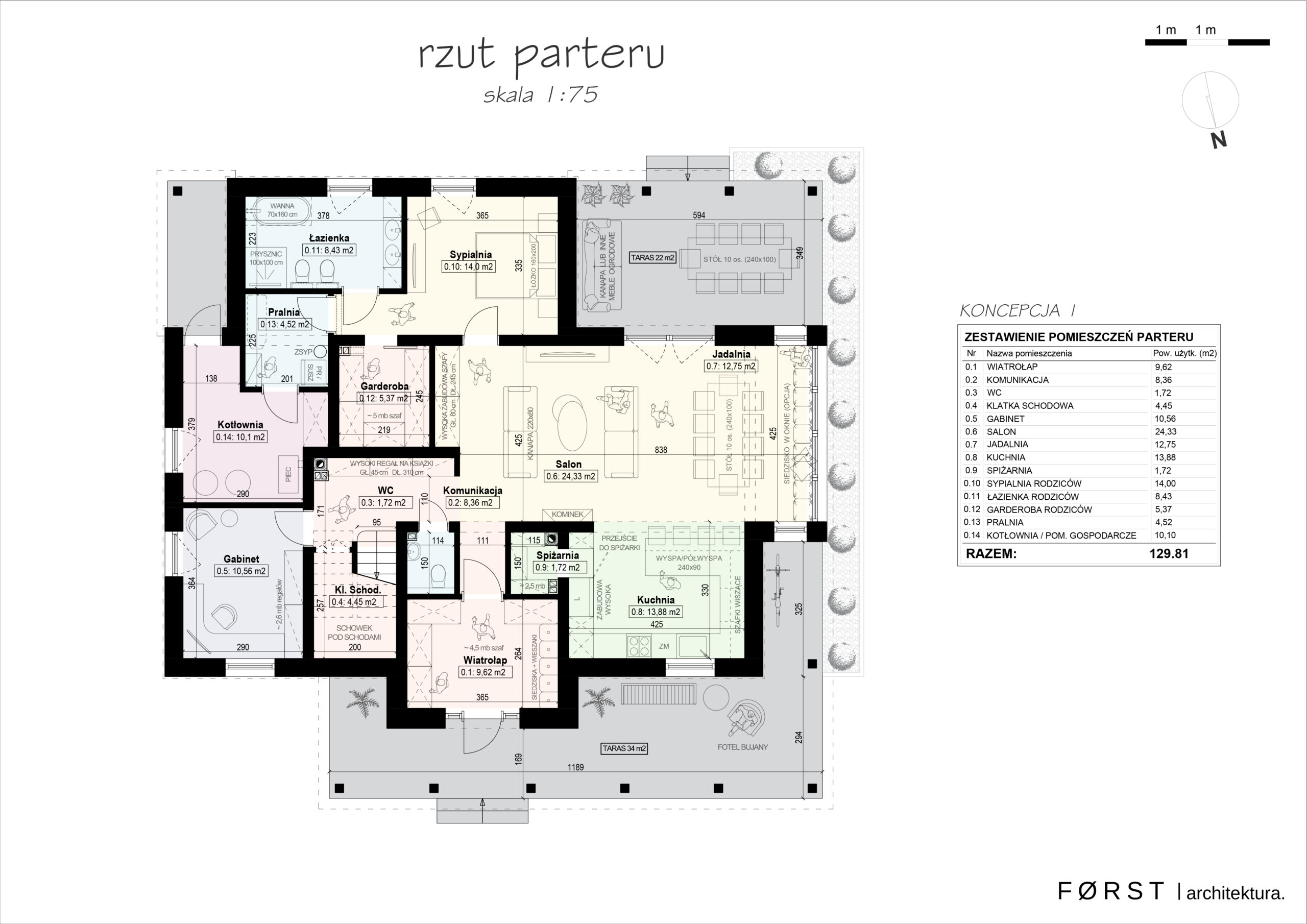 Niemal 130 metrów kwadratowych powierzchni użytkowej parteru mieści wszystkie potrzebne pomieszczenia tj. przestronny wiatrołap (niezbędny w poprawnym funkcjonowaniu tak licznej rodziny), salon z kominkiem zlokalizowany w centralnej części (serce domu), wygodną kuchnię ze spiżarką, jadalnię z dużym stołem i unikalnym, obszernym siedziskiem przy oknie, wc, klatkę schodową, gabinet, prywatną sypialnię rodziców wyposażoną w garderobę i odrębną łazienkę, pralnię i kotłownię. Dom okalają liczne tarasy/ganki pełniące ważną rolę w planowanej funkcji domu. Taras główny dostępny z salonu i jadalni, skierowany na południowy-zachód na którym zmieści się duży stół oraz meble ogrodowe. Ganek przy wejściu poza rolą zadaszenia nad wejściem pełni także funkcję rekreacyjną z możliwością wyposażenia go w ławki lub fotel bujany. Niewielki taras z tyłu domu jako techniczne wejście do kotłowni/narzędziowni oraz pralni.