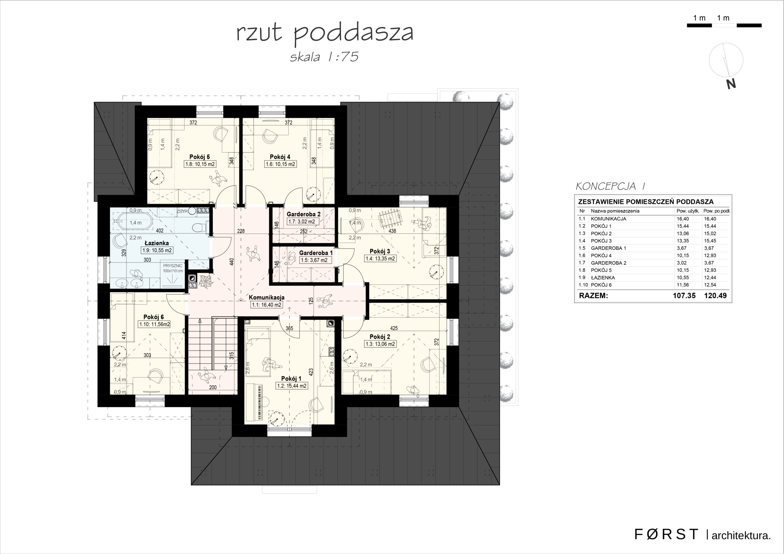 Poddasze budynku w całości przeznaczone jest dla dzieci. Ponad 100 metrów kwadratowych powierzchni zagospodarowaliśmy na 6 wygodnych pokoi, przestronną łazienkę oraz komunikację umieszczoną w centralnej części domu. Opcjonalnym rozwiązaniem są dwie dodatkowe garderoby obsługiwane z wybranych pokojów, które równie dobrze można przekształcić na jedno pomieszczenie magazynowe lub na wspólną, otwartą przestrzeń bawialni.