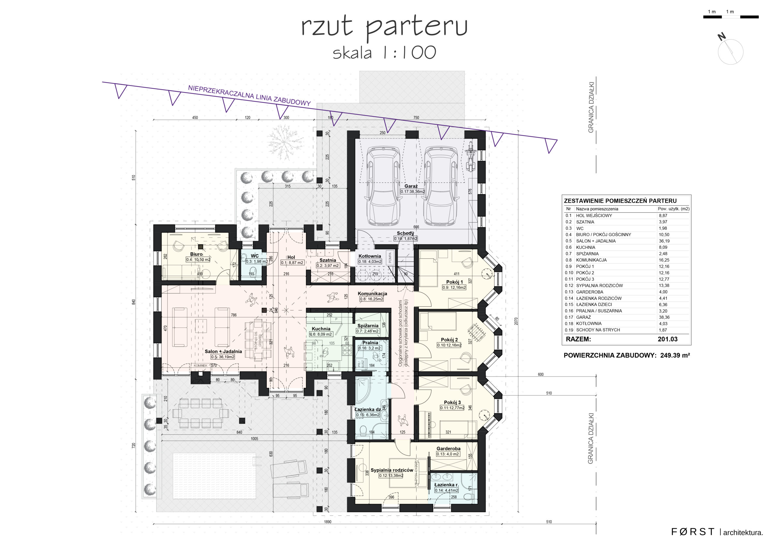 Niewiele ponad 200 metrów kwadratowych powierzchni użytkowej mieści wszystkie potrzebne pomieszczenia niezbędne do funkcjonowania dużej rodziny. W projektowanym domu znajduje się dwustanowiskowy garaż z wejściem na strych, kotłownia, szatnia, wysoki salon z jadalnią, kuchnia ze spiżarką, biuro, trzy dobrze naświetlone pokoje dla dzieci, duża łazienka z pralnią oraz sypialnia rodziców z odrębną garderobą i łazienką.