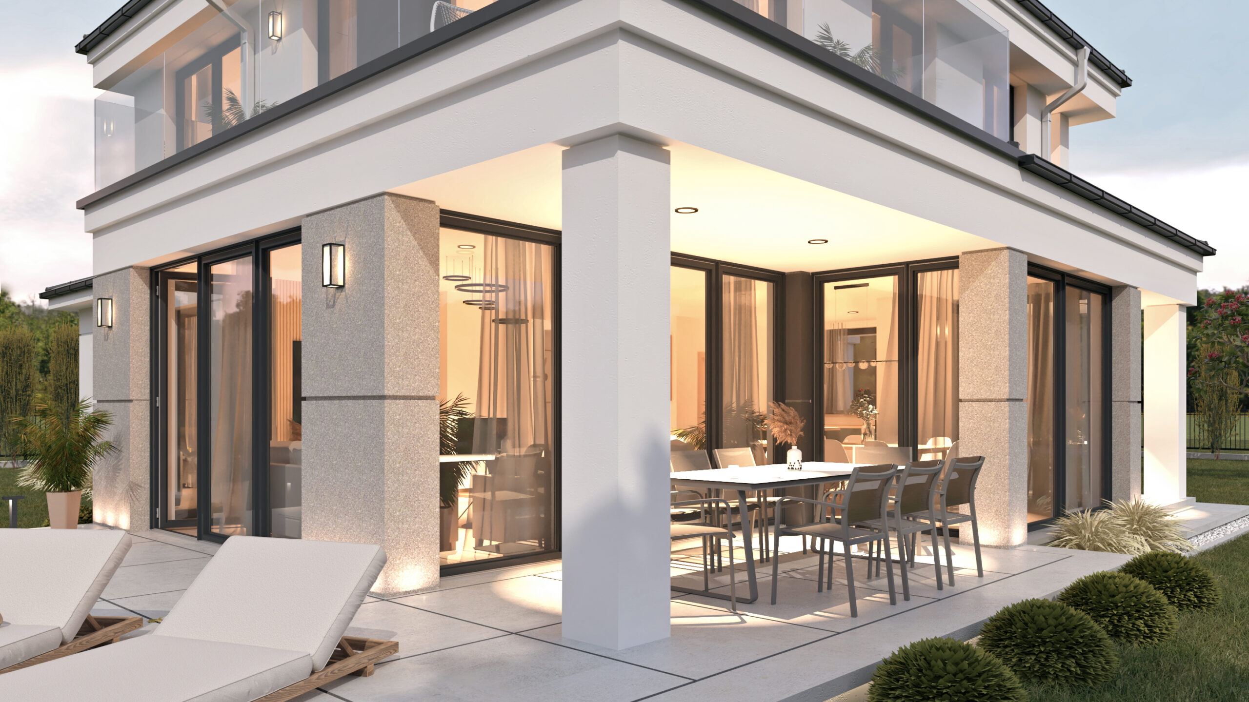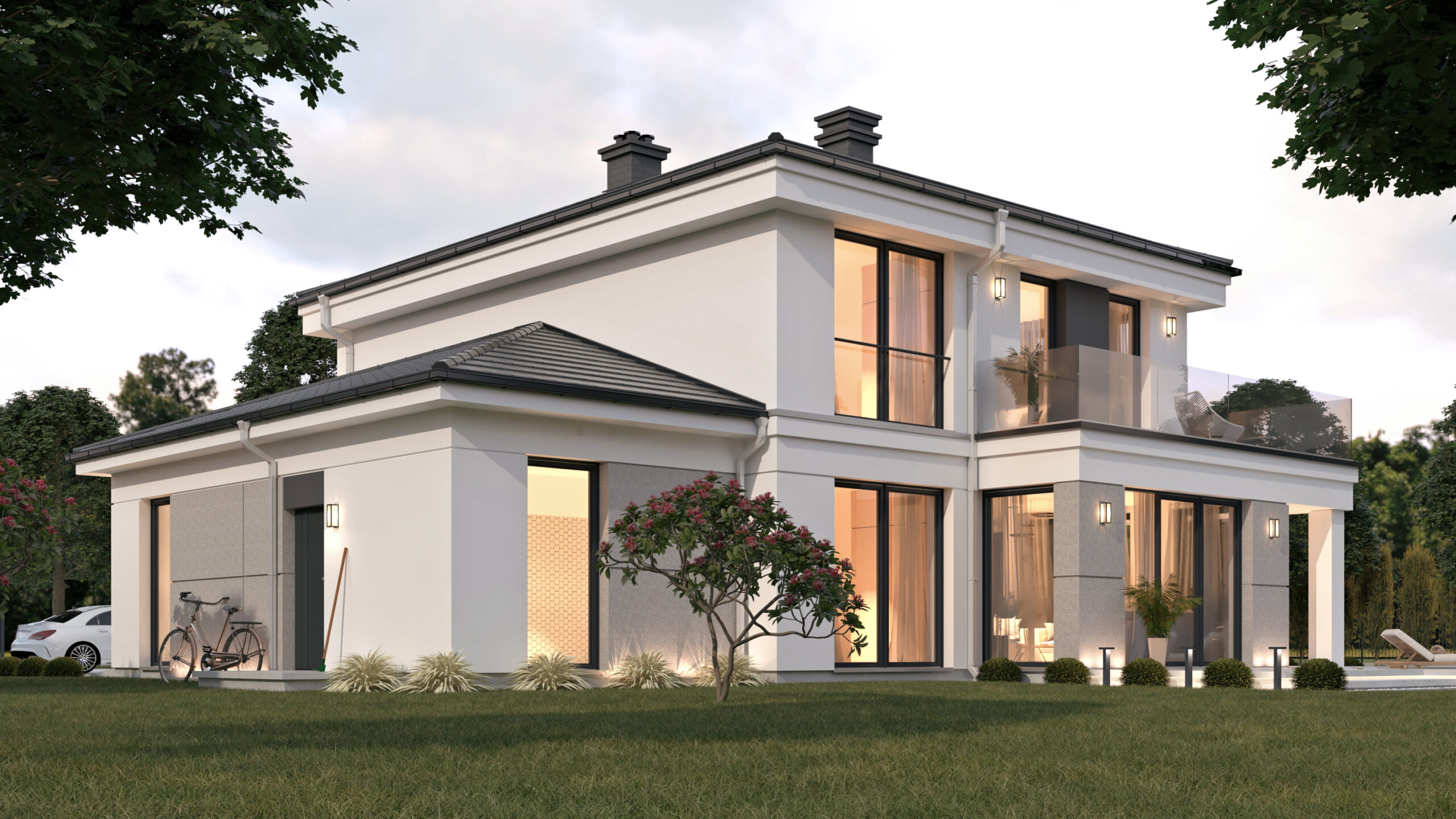 Postawiliśmy na powszechne materiały wykończenia zewnętrznego takie jak: grafitowa dachówka ceramiczna, grafitowe rynny prostokątne i srebrne rury spustowe, biały tynk mineralny oraz nieliczne wstawki ze strukturalnych tynków beżowoszarych i grafitowych. Po kilku próbach kolorystycznych zgodnie zatwierdziliśmy stolarkę okienną i drzwiową w odcieniach grafitowych, nawiązującą do dachu i jego obróbek. Dwa tarasy dostępne z piętra okala balustrada całoszklana, która nadaje nowoczesnego charakteru i nie wprowadza dodatkowych horyzontalnych podziałów elewacji. Podesty wejściowe, chodniki, podjazdy oraz tarasy naziemne wykonane z betonu architektonicznego w półpołysku.