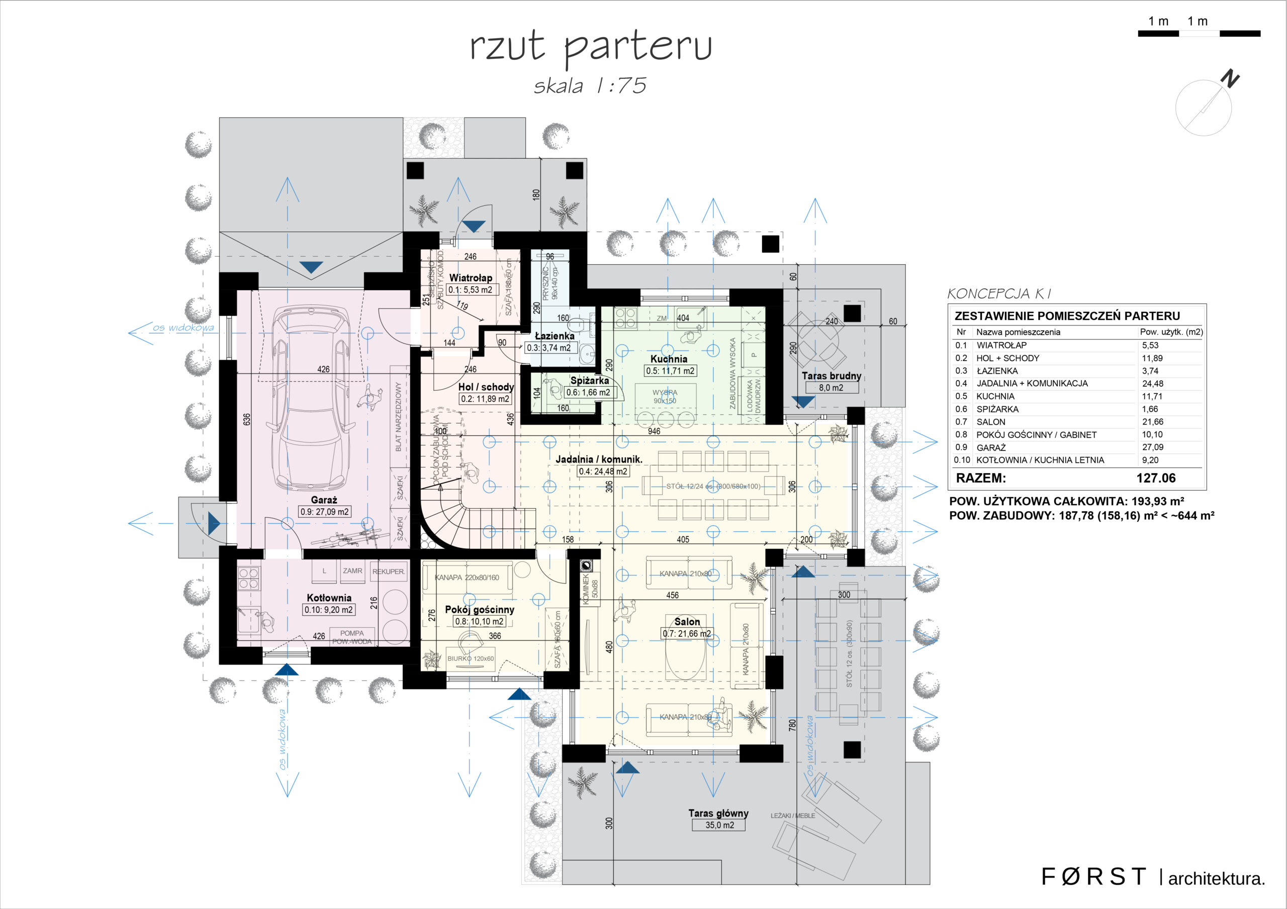Parter budynku o powierzchni 127 m2 mieści wszystkie potrzebne pomieszczenia niezbędne do funkcjonowania dużej rodziny. W projektowanym przyziemiu domu znajduje się 1,5-stanowiskowy garaż z wejściem do kotłowni (i kuchni letniej), wiatrołap, hol wejściowy z otwartymi i zaokrąglonymi schodami, niewielka łazienka z prysznicem, kuchnia z wyspą i dedykowaną spiżarką, jadalnia z możliwością przyjęcia blisko 30stu gości, wysunięty salon z dostępem na taras oraz pokój gościnny.