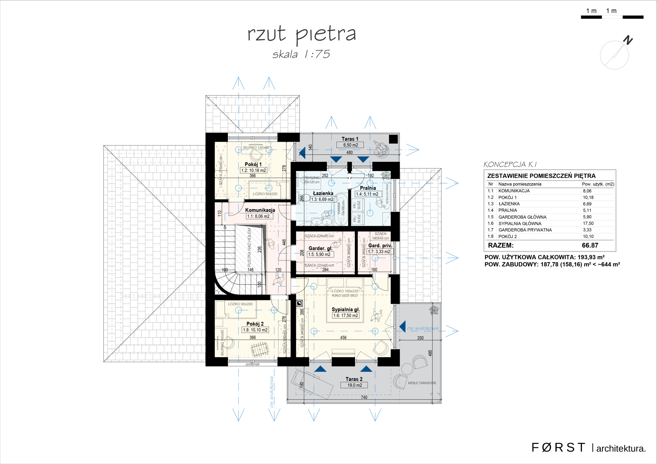 Piętro będące strefą prywatną, wyposażone jest w otwartą komunikację (z widokiem na hol parteru), master bedroom z własnym tarasem i garderobą, dwa pokoje dla dzieci, łazienkę i pralnię z własnym tarasem oraz garderobę ogólną dostępną z korytarza.